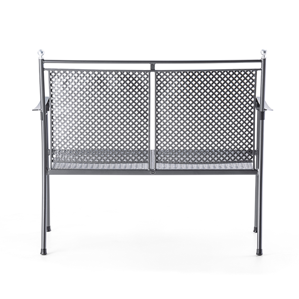 Die wetterfeste 2-er Gartenbank EXCELSIOR sorgt für einen Hauch von Nostalgie in Ihrem Garten. Diese Gartenbank ist äusserst wetterfest und vereint traditionelle Formen mit hochwertigem Material. Das Gestell besteht aus Stahl mit einer Thermosint Beschichtung in eisengrau. Optisch ist diese Terrassenbank ein echter Hingucker durch ihre Sitz- und Rückenfläche in der Rautenmaschen-Optik, den verspielten Armlehnen sowie den Silberkugeln.