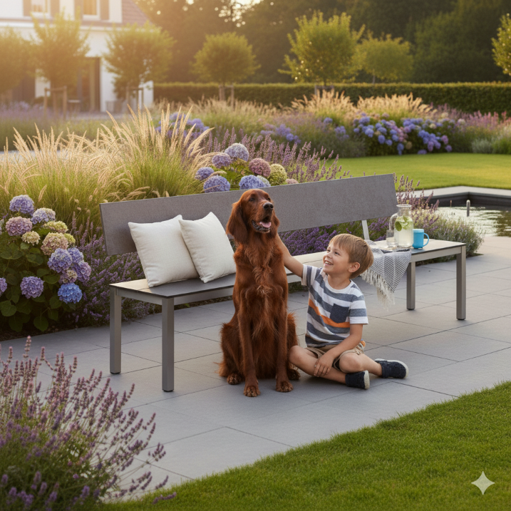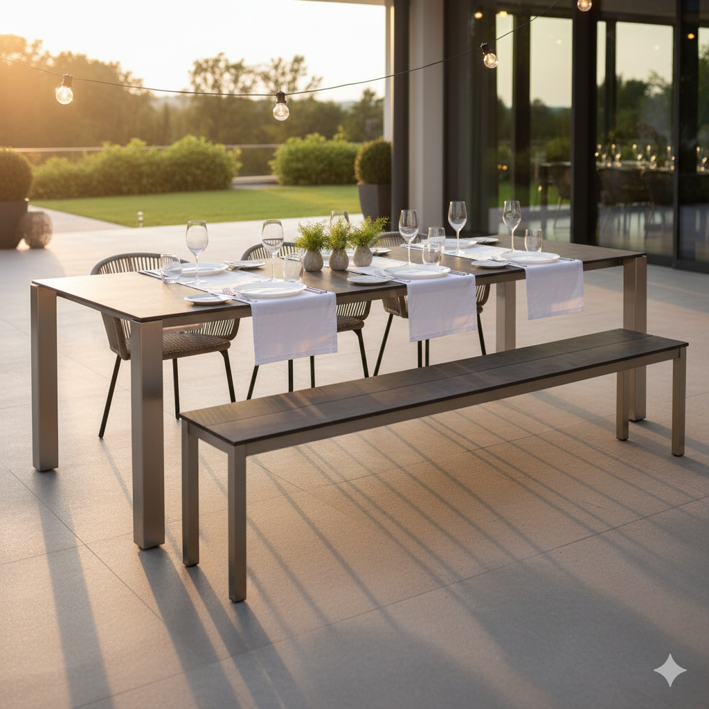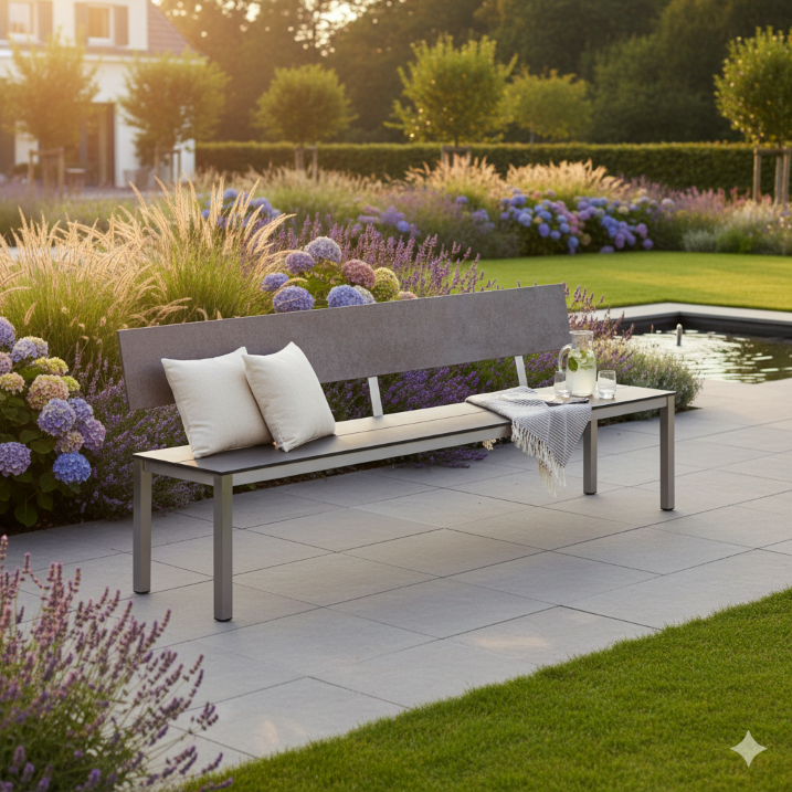 Ob als Sitzbank am Esstisch, als großzügige Lösung für die Terrasse oder als langlebiges Gastromöbel: Morcote verbindet zeitloses Design mit hoher Funktionalität für den Außenbereich. Dank der hochwertigen Premiumverbundplatte ist die Sitzfläche besonders wetterfest, beständig und pflegeleicht – ideal auch für ungeschützte Außenbereiche, in denen Möbel Wind, Regen und Sonne dauerhaft standhalten müssen. Das stabile Gestell sorgt für sicheren Stand und eine klare, moderne Optik.