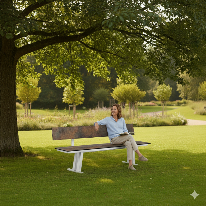 Die Sitzfläche wird aus einer langlebigen Premiumverbundplatte gefertigt. Diese ist besonders wetterfest, beständig und pflegeleicht und eignet sich dadurch auch für ungeschützte Außenbereiche. Wind, Regen und starke Sonneneinstrahlung machen der Bank nichts aus – sie bleibt über viele Jahre hinweg formstabil und optisch hochwertig.