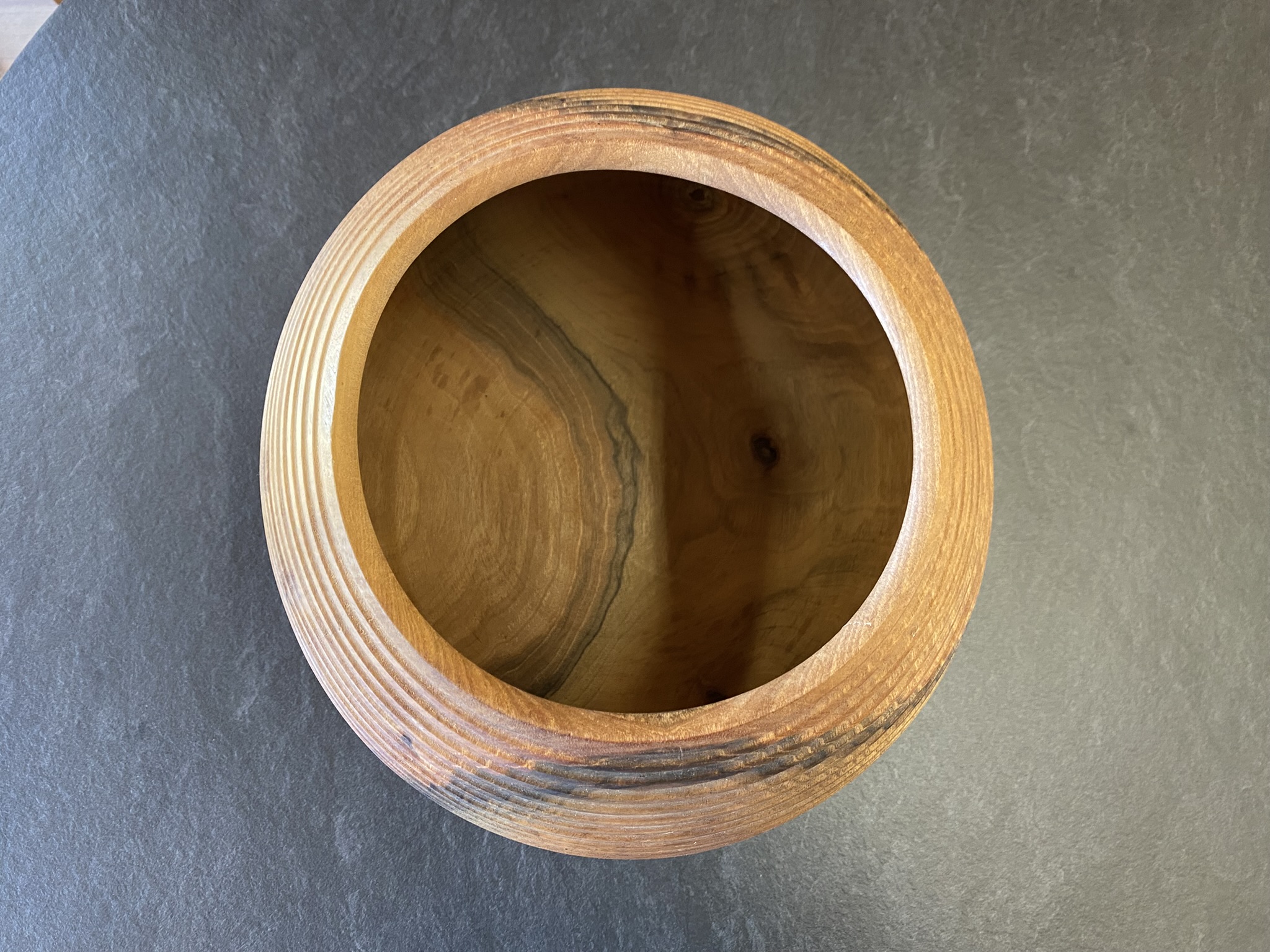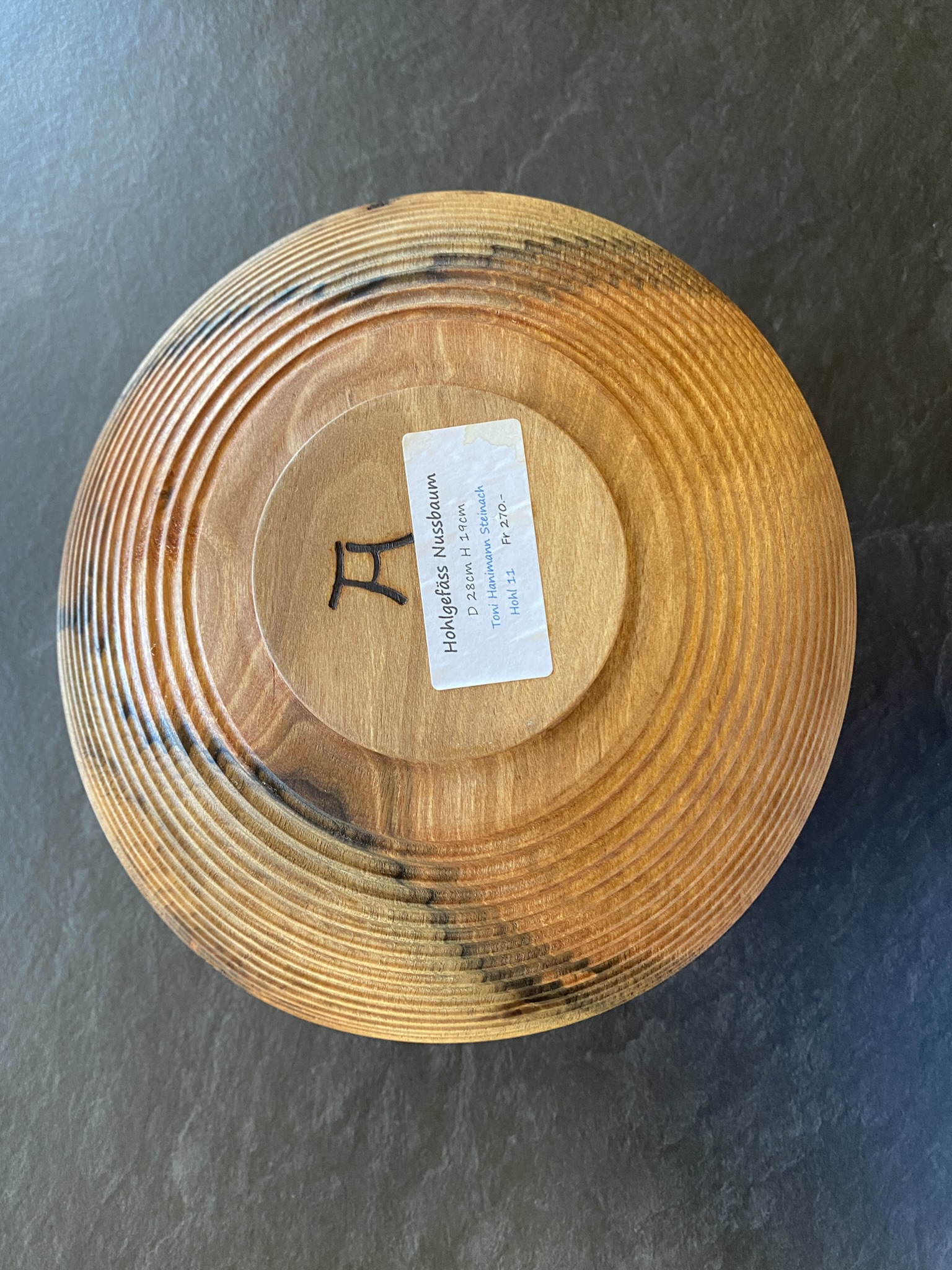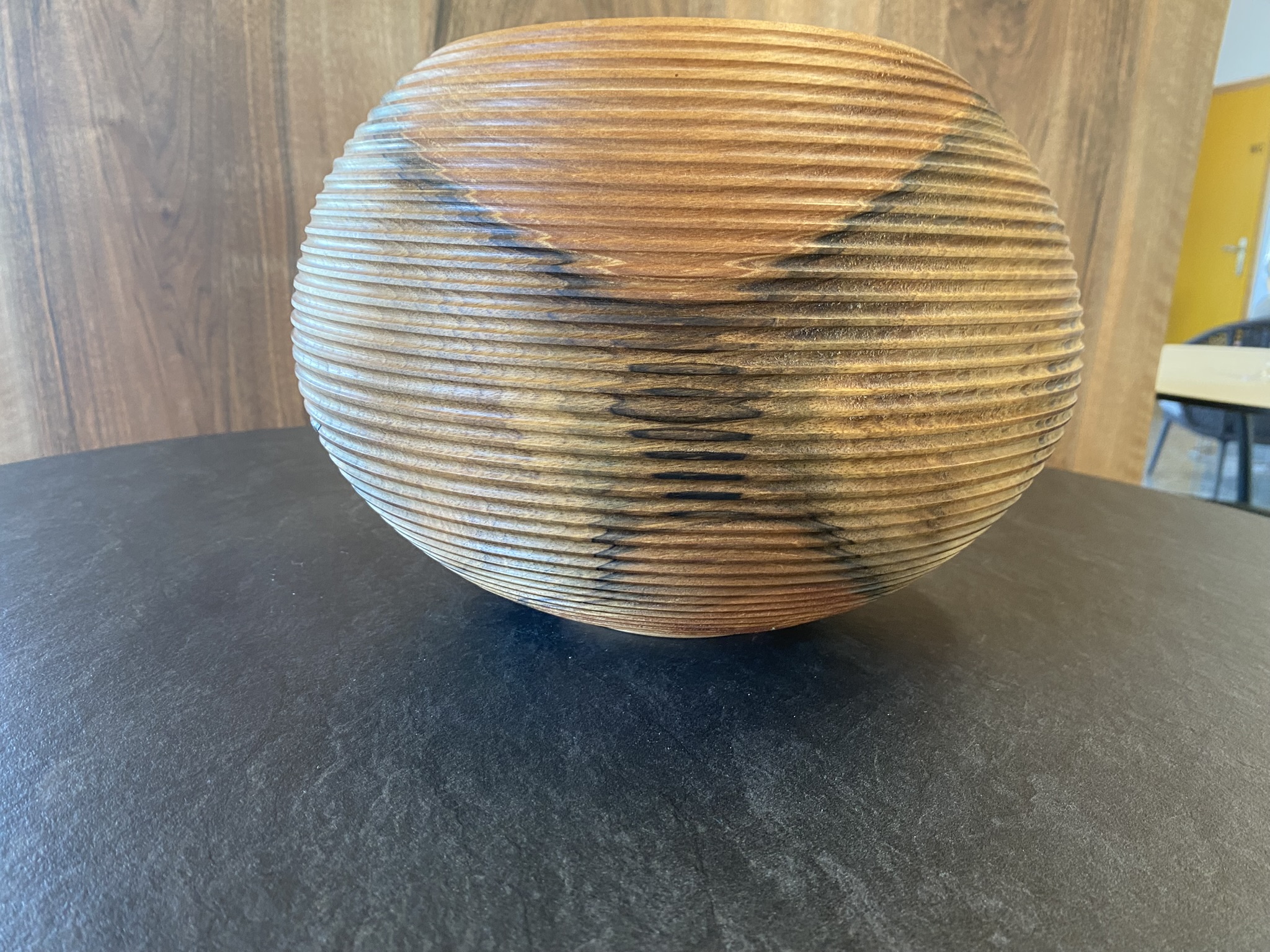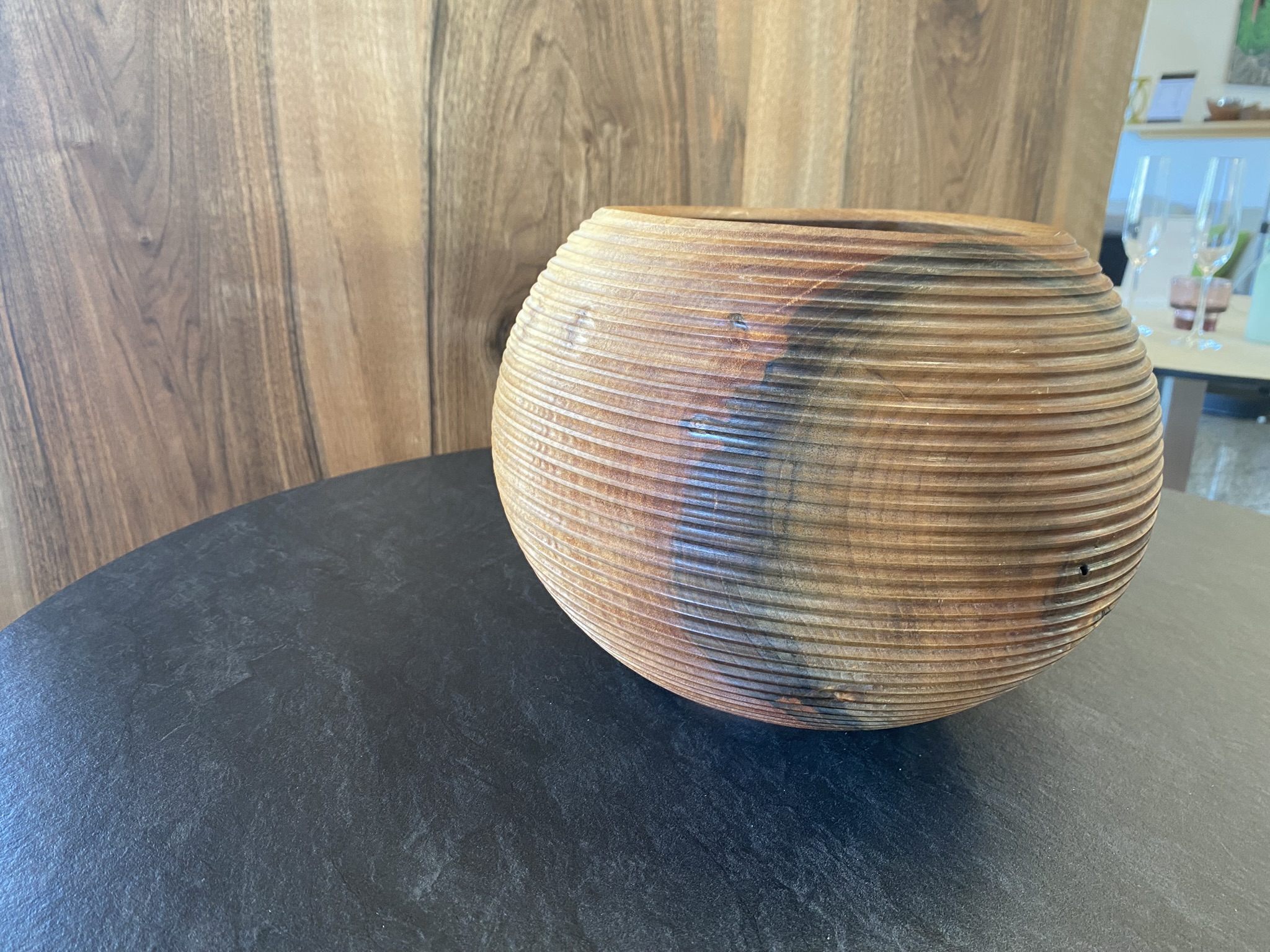Das Hohlgefäss ist ein herausragendes Design-Objekt und ein Beweis für die Meisterschaft des Drechslers Toni Hanimann. Die gesamte Oberfläche wurde mit feinen, horizontalen Rillen versehen, die das Material fast wie eine Textil-Struktur erscheinen lassen. Gefertigt aus edlem Schweizer Nussbaumholz, das durch dunkle Stockungen akzentuiert wird, ist dieses Gefäss ein modernes, warmes Statement für jeden Raum.