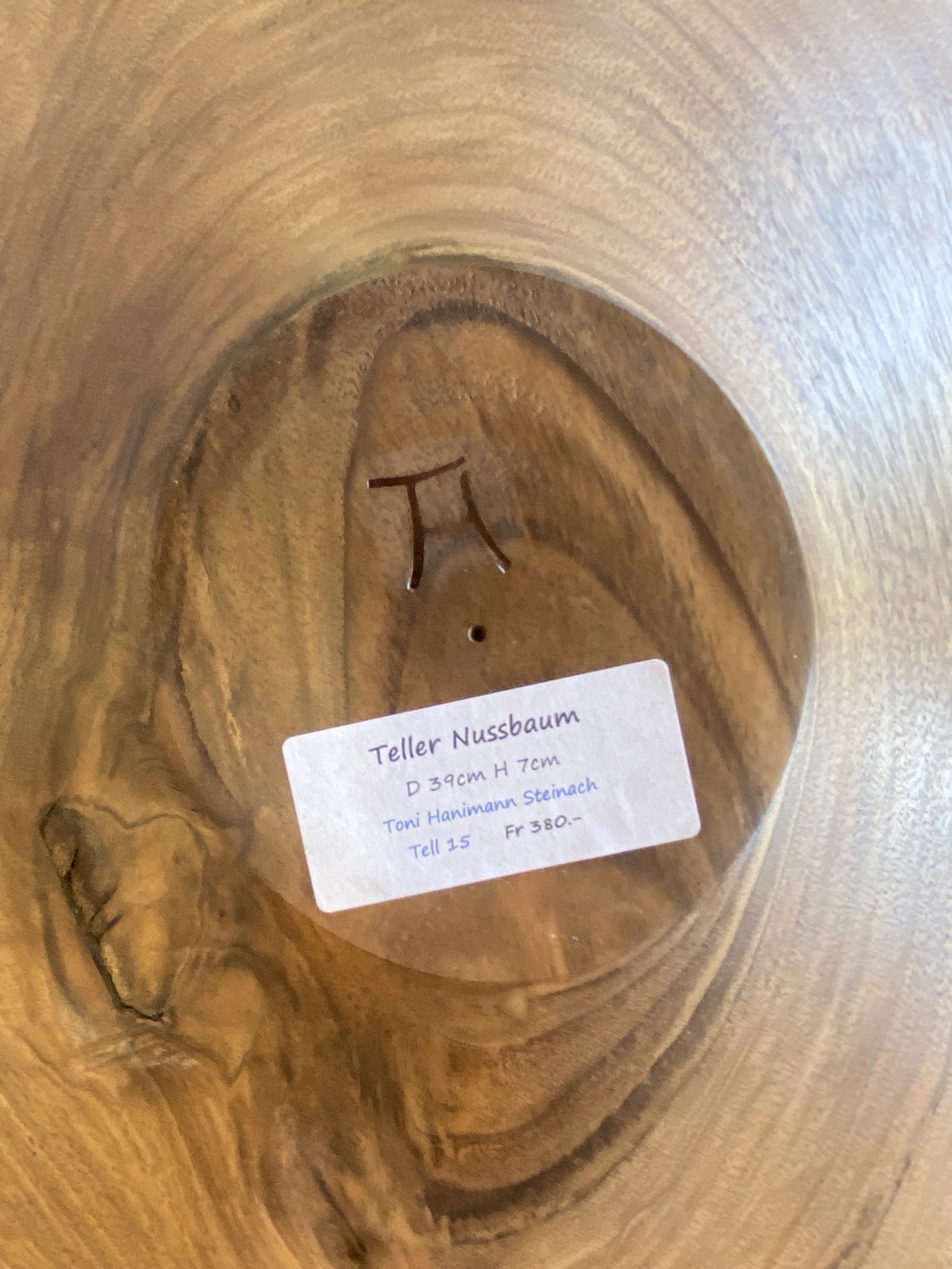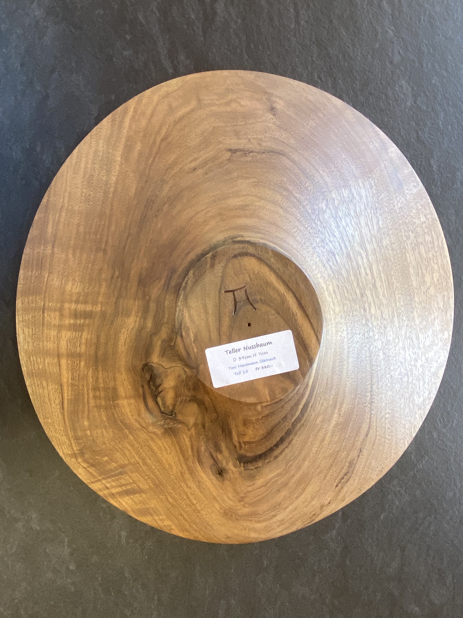 Der Teller ist ein exquisites, flach gedrehtes Unikat aus intensiv gemasertem Nussbaumholz. Gefertigt von Toni Hanimann, besticht dieses Objekt durch seine aussergewöhnliche Tiefe der Maserung und die sanfte, asymmetrische Wölbung, die es wie eine Skulptur erscheinen lässt. Perfekt als luxuriöser Servierteller, Obstschale oder als reines Design-Highlight.