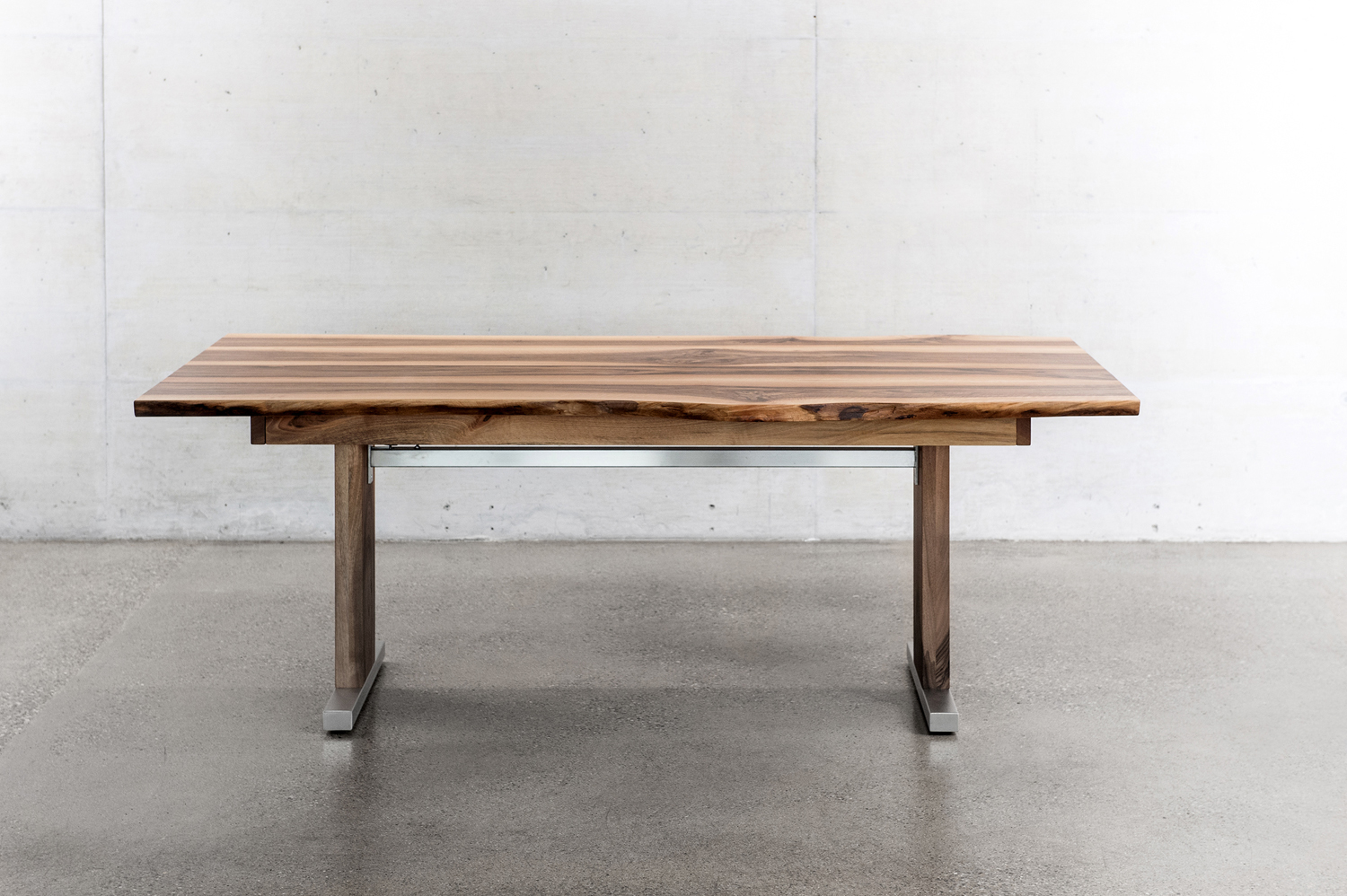 Unser eigener Tischfuss, passend zu unseren Tischen. Trotz der massiven Bauweise wirkt er durch die Mittelanordnung optisch leicht.